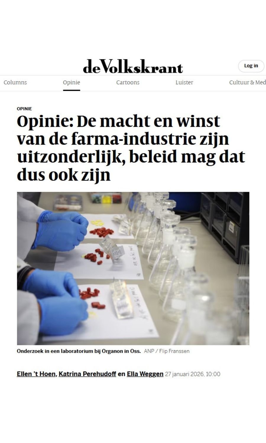 In a joint opinion piece for the Dutch newspaper De Volkskrant, Ella Weggen (Wemos), Ellen 't Hoen (Medicines Law & Policy) and Katrina Perehudoff (University of Amsterdam) argue that the pharmaceutical industry is a unique industry and therefore requires unique regulation. The government should be able to demand transparency regarding the development costs of medicines, the amount of public money invested, and profit margins. This is necessary to achieve fair prices for new medicines.